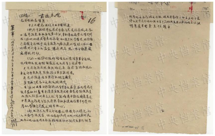 1937年10月17日,朱德、任弼时关于尽可能保持太原、固守雁门关及八路军行动部署致毛泽东等电。